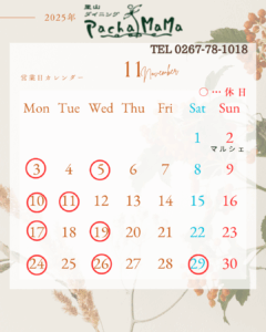 11月営業日のご案内☺️ 2025.10.31 11月の営業日ご案内です🎵 お待ちしております!! お気軽にお問い合わせください☺️ 店舗情報 店舗名 PachaMaMa 代表 菊池 初恵 住所 〒384-1211 長野県南佐久郡南相木村4392-1 TEL 080-1149-0730 ※上記の番号が不在の場合は、こちらにお掛けください。 ※0267-78-1018 営業時間 LUNCH 11:00~17:00 (予約無しでもご利用いただけます) DINNER 完全予約制 定休日 月曜日 駐車場 最大8台 Tweet Share この記事のタイトルとURLをコピーする 10月営業日のご案内 前の記事